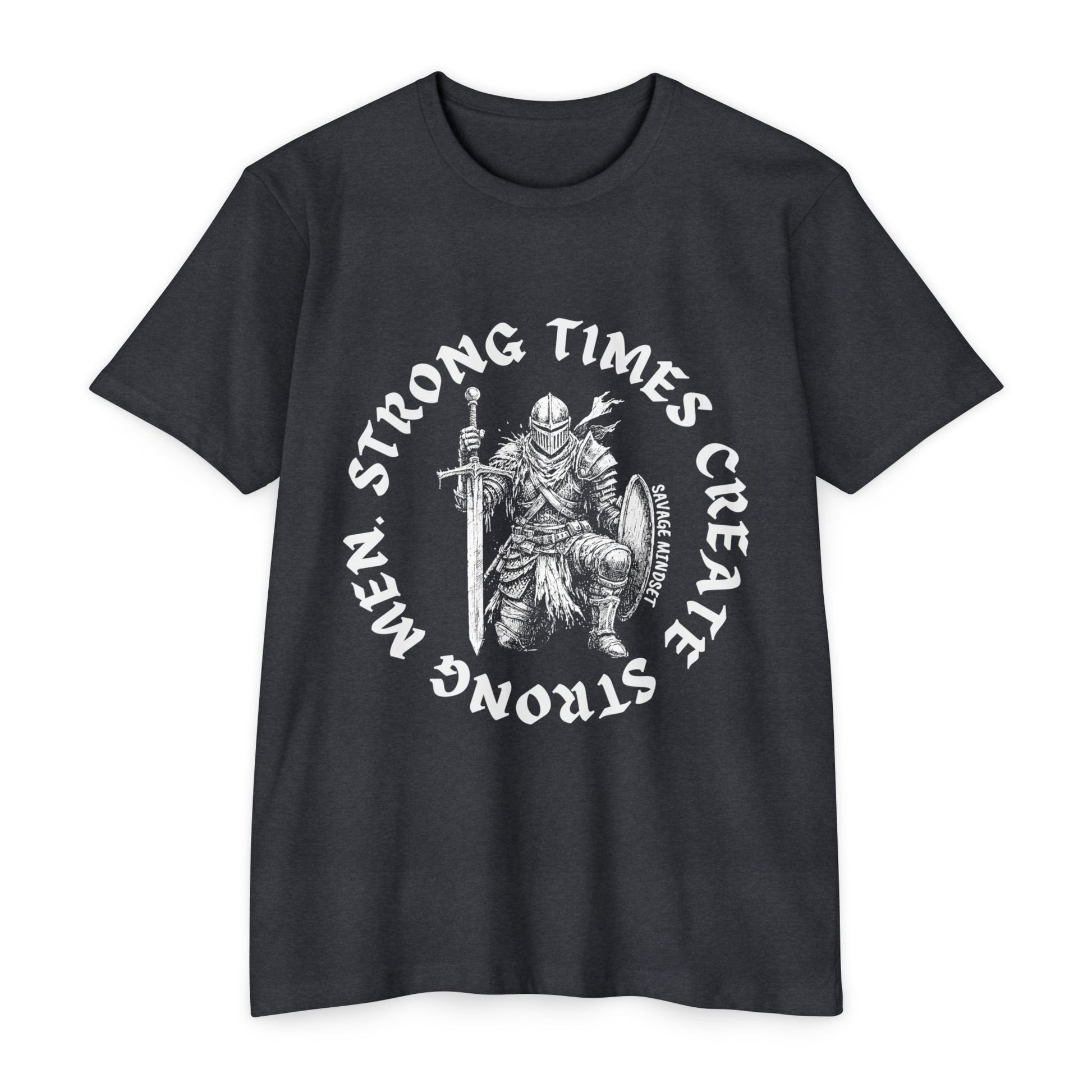 Forge yourself in the fire with the “Strong Times Create Strong Men” tee. Featuring a battle-ready knight kneeling with sword and shield in hand, this design embodies resilience, discipline, and the iron mindset required to thrive in tough times. Built for men who refuse weakness, embrace challenge, and carry themselves like modern-day warriors—on the jobsite, in the gym, or in everyday life.